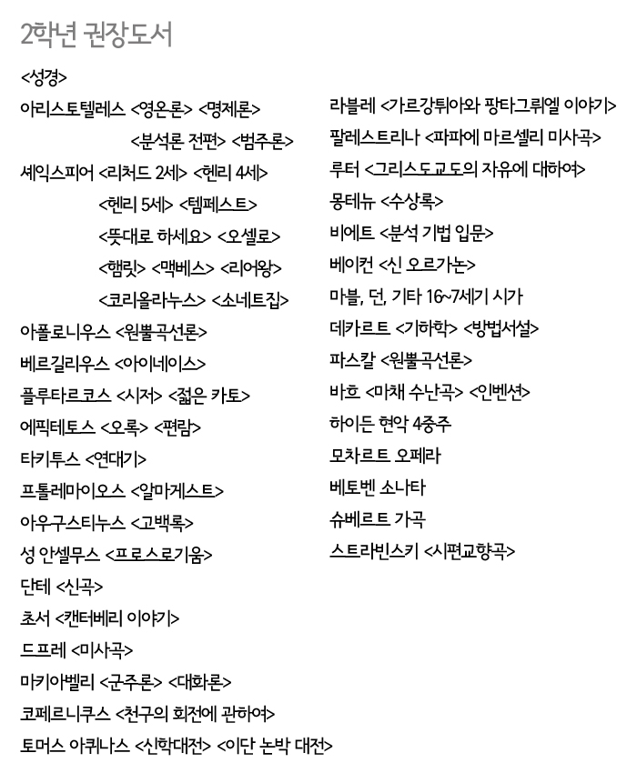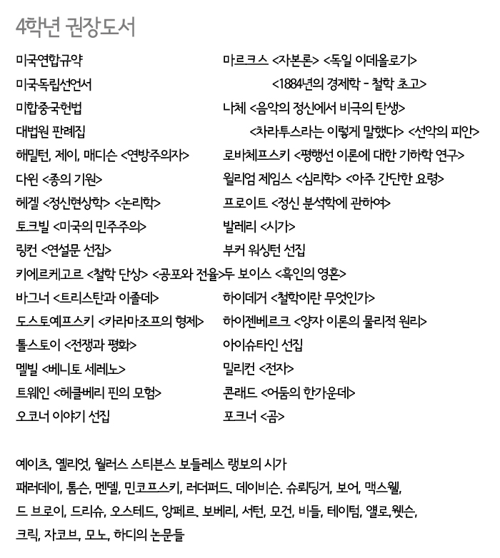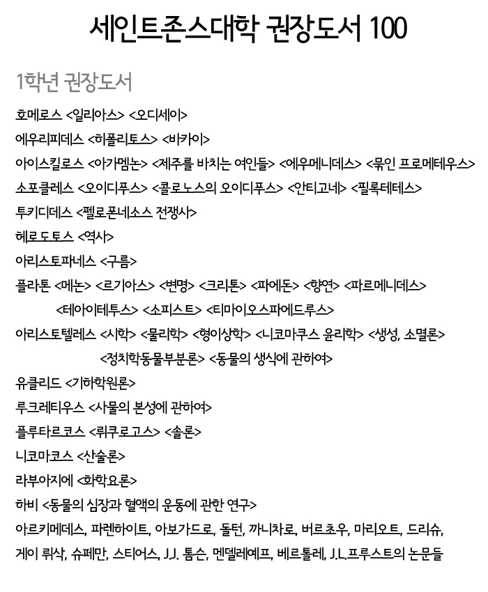 그러다가 이번에 세인트존스 대학교에서는 졸업하기 전까지 권장도서 100권을 읽어야 졸업을 한다는..? 이야기를 접하게 되어서 인터넷을 뒤지다 그 권장도서 목록을 찾게 되었다.